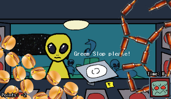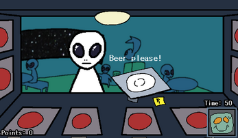 Before you notice anything else, the intercom goes off. "We are going to travel at lightspeed in approximately 60 seconds. Get your lunch in the cafeteria before we leave." You look at the opening in front of you, and see a long line of the ship's crew getting ready to order. It's up to you to give them what they want, and you don't have much time to do it.